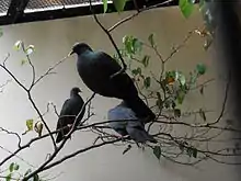 The black wood pigeon or Japanese wood pigeon (Columba janthina) is a species of bird in the family Columbidae. It is found in East Asia along shorelines of the Pacific's Korea Strait, Philippine Sea and East China Sea. It is believed to be the largest representative of the genus, Columba, and has a weight of around 550 grams (1.2 lb) and an overall length of 43 cm (17 in). Its natural habitats are temperate forests and subtropical or tropical moist lowland forests. The species is in decline owing to habitat loss, habitat degradation, deforestation and hunting. This wood pigeon is endemic to the laurel forest habitat.