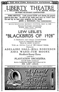 The show originally opened on January 4, 1928, under the heading The Blackbird Revue at Les Ambassadeurs Nightclub in New York, before transferring in May 1928 to the Liberty Theatre on Broadway,[3] where Lew Leslie changed the shows name to Blackbirds of 1928.[4] The original Broadway production opened at the Liberty Theatre on May 9, 1928, where it ran for 518 performances, becoming the longest running all-black show on Broadway. It was directed by producer Lew Leslie and starred Adelaide Hall,[5] Bill Bojangles Robinson.[6] Aida Ward, Tim Moore, Blue McAllister, the Blackbirds Beauty Chorus and the Famous Blackbirds Orchestra conducted by Felix Weir. Also in the cast were Johnny Hudgins, Eloise C. Uggams, Elisabeth Welch, Mantan Moreland, Cecil Mack, Evelyn Anderson, and Nina Mae McKinney. Orchestral arrangements were by Will Vodery.