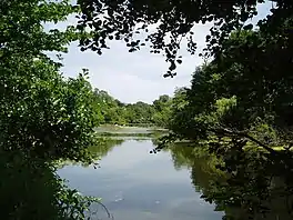 The water is eutrophic due to run-off from the neighbouring allotments, as well as remains of bread given to birds and the faeces of the birds.[3] This can lead to algal blooms that deplete the level of oxygen in the pond.[3] There are no visible inflows, but there is a drain at the eastern end which keeps the water level constant.[2]