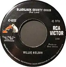 Lane then offered the song to his friend Willie Nelson. Nelson had recently a hit single with "The Party's Over", that peaked at twenty-four in Billboard's Hot Country Singles. Nelson's version of "Blackjack County Chain" was released with a cover of Floyd Tillman's "Some Other World" on the flipside.[2] The single debuted in May 1967. RCA Records published a full-page advertising promoting the single on Billboard.[3] On its review, the publication praised the work of producer Chet Atkins, while it declared "(Nelson's) moving rendition [...] should be working its way up to the top".[4]