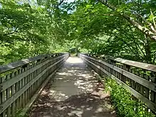 The line continued to serve local passenger and freight trains for decades, but flooding in August 1955 destroyed the critical bridge work in Putnam and lead to its closure in the 1960s.[11] Several years after its abandonment the railroad was sold to Connecticut's Department of Transportation.[10] By 1983, the abandoned railroad bridge had its span sealed off and its tracks lifted. The bridge is in the Salmon River State Forest and is a part of the Air Line State Park Trail.[2][12] A new wooden bridge allows transportation over the Blackledge River.[12] Constructed prior to 2007, the new wooden bridge decks the railroad bridge.[13] The Connecticut Department of Environmental Protection was assisted by the Coast Guard Academy and the 192nd Engineering Battalion of the Connecticut National Guard.[13]