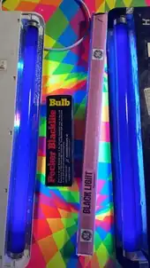 Two examples of fluorescent blacklight bulbs with light fixtures and packaging and a novelty incandescent bulb.