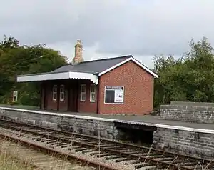 The platform was approached from the main road by a steep footpath and the two platforms were joined by a barrow crossing. The platform contained a sizeable waiting room, and a notably tall signal box. The waiting room was fronted by blue diamond-cut setts rather than ash, whilst the area in front of the signal box was clad with wooden planks overlaying a cavity through which the rods and wires were channelled.
