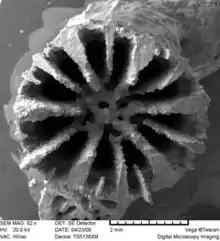 Young colonies of this coral have each corallite extending out from a common, dome-shaped centre. However, over time these individual corallites become separated and the colony could be considered to be a group of cloned, solitary individuals.[3] The corallites are less than 7 millimetres (0.3 in) in diameter. The septa have toothed margins and are arranged in two cycles, only the first of which reaches to the central columella. The polyps are only extended at night. This coral may be dark red, pink, orange, brown or dark grey, often with contrasting green oral discs.[4]