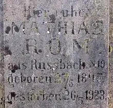 Blatnik pri Črmošnjicah was attested in written sources as Ruespach in 1574.[5] The toponym Blatnik is relatively common in Slovenia and generally refers to low-lying areas near water; it is also found as a hydronym and surname. The name is derived from the common noun blato 'mud; swamp, marsh', which is also the root of names like Blače, Blatno, and Blate.[6] In this case, the settlement lies in an area with several karst springs feeding Blatnik Creek (Blatniški potok), a tributary of Vrčica Creek.[7] In the past, Blatnik pri Črmošnjicah was known as Rußbach in German.[2] The name Rußbach is a compound of Ruß 'soot(y), black' and bach 'creek', referring to the former name of Blatnik Creek[7] (cf. also medieval Růzpach, now Sajevec).