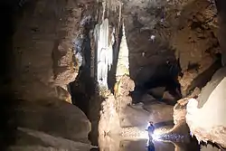 The Blauhöhle is the largest cave system in the Swabian Alps in southern Germany. The Blauhöhle presumably originated in a time when the Danube still flowed through the Blau valley. Since the shifting of the Danube, several small rivers, the Schmiech, the Ach, and the Blau, have flowed through this valley. The cave system begins about 21 meters under water at the base of the Blautopf. It continues west and northwest, rising and falling several times until after a horizontal distance of about 1,200 metres (3,900 ft) it comes above the level of ground water and opens into the second big air-filled chamber. The maximum depth of the cave under water is 42 metres (138 ft).