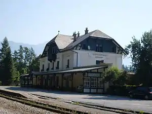 Bled Jezero railway station (Slovene: Železniška postaja Bled Jezero) is the principal railway station in Bled, Slovenia. The station is located above the west coast of Lake Bled. It is connected to the lake and the settlement Zaka by a footpath. It is located on the Jesenice - Sežana railway and train services from Jesenice to Nova Gorica call here approximately once every two hours in each direction, however the timetable is irregular. Some of the services are extended from/to Ljubljana and Sežana.[1]