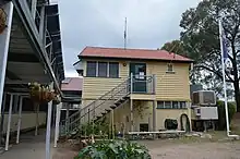 Plans for the residence at Blenheim show a standard 1930s "Teachers Residence".[50] Built from 1929 to 1949, this type was a highset timber-framed structure, with a hipped roof with projecting gable at the front, and an L-shaped verandah to the northwest corner.[51][52] The interior comprised a core of three bedrooms and a living room arranged around a central hallway, with a rear wing that included a kitchen with stove alcove, storeroom, pantry and bathroom. French doors opened onto the verandah; and the six-light casement windows on exposed exterior walls had skillion hoods. Timber stairs accessed the front verandah and a landing to the rear, and an understorey laundry was located below the kitchen. Corrugated metal water tanks on timber platforms were located to the rear and side of the residence.[53] When built, the Residence at Blenheim had a layout that mirrored its documented plan, with its L-shaped verandah positioned in the northeast corner.[1]