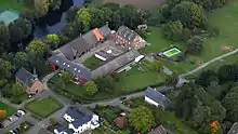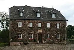 The "castle" has a quadrangular layout of domestic buildings with a two-storey, rectangular manor house of rubble stone with a half-hipped roof that was built around 1791. Of the former medieval hill castle only the stump of a round tower and some remains of the enceinte have survived. A rarity is the surviving paving of the courtyard with Rur pebbles.