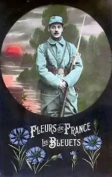 At the same time, the term "bleuets" was used also to refer to the class of conscripted soldiers born in 1895 who arrived in the lead-up to the Second Battle of the Aisne, because of the bleu horizon worn by French soldiers after 1915. The uniform worn by these recruits, many of whom were not even twenty years old, was distinctive because it marked a break from the pantalon rouge trousers worn by older soldiers, which were part of the standard uniform before the First World War.[2]