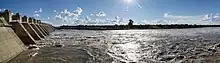 Bloemhof Dam is a dam in South Africa. It was originally known as the Oppermansdrif Dam when under construction during the late 1960s. It is located at the confluence of the Vaal River and the Vet River, on the border between the provinces North West and Free State. The dam wall has a total length of 4,270 metres (14,010 ft) The reservoir is very shallow, and therefore needs a large area to mean anything for water storage. The area around the reservoir (dam), has been a protected area, but because it lies on the border between provinces, these became two separate nature reserves. On the North West Province side lies the Bloemhof Dam Nature Reserve, on the Free State side is the Sandveld Nature Reserve.