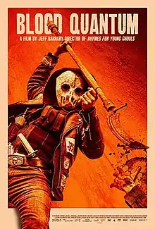 Blood Quantum is a 2019 Canadian horror film written, directed, and edited by Jeff Barnaby and starring Michael Greyeyes, Elle-Máijá Tailfeathers, Forrest Goodluck, Kiowa Gordon, Brandon Oakes, Olivia Scriven, Kawennáhere Devery Jacobs, and Gary Farmer.[2][3] The film depicts the effects of a zombie uprising on a First Nations reserve whose residents are immune to contracting the plague because of their indigenous heritage, but must still cope with the consequences of its effects on the world around them, including white refugees seeking shelter on the reserve.[3]