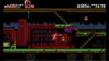 Bloodstained: Curse of the Moon is a 2D side-scrolling platformer that plays and looks similar to Castlevania games on the Nintendo Entertainment System (NES), most notably Castlevania III: Dracula's Curse (1989).[1][2] Like Castlevania III, the game features stages with branching paths that lead to a single boss, and multiple playable characters.[3] The player starts as swordsman Zangetsu, and may recruit up to three other characters as they progress including the whip-wielding Miriam, a magician named Alfred, and the vampire-like Gebel.[4][2] Each character has different weapons, skills, health points, and attack styles that make them more appropriate for different situations.[1][4] The player may switch between these characters instantly at any time.[4][2] If a character dies, they become unavailable for the rest of the level, which may limit the player's ability to explore the remainder of the stage. In such instances, the player can restart the level with all characters again.[4] The player has the ability to enable and disable unlimited lives and the player character is knocked back when hit by an enemy, characteristic of classic Castlevania gameplay.[4] There is also a boss rush mode, and other options to increase game difficulty.[5]