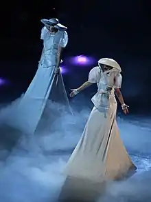 Gaga performed "Bloody Mary" during her third headlining concert tour, the Born This Way Ball (2012–2013). She wore a white dress and helmet, and appeared with two female dancers who were dressed in the same outfit.[75] The three women moved around a circular runway on remote-controlled platforms, creating an illusion of the performers floating above the stage.[75][76] Gaga's male dancers wearing miniskirts followed them.[75] The Line of Best Fit's Charlie Ivens said Gaga appeared as a "cosmic beekeeper" during the "absurdly bouncable beats" of the song.[77] According to Chase Wade of The Dallas Morning News; "'Bloody Mary' unnerved as she delivered operatic vocals in an all-white gown while gliding like some kind of automaton bride".[78]
