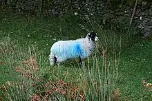 The fleece of sheep may be a natural blue-grey, such as the Himalayan blue sheep, or may be dyed blue as a raddle or to make them more conspicuous in snowy conditions.[20][21]