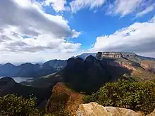 The Blyde River Canyon is a 26km long[1] Canyon located in Mpumalanga, South Africa. It is one of the larger canyons on Earth but much smaller than those of Asia, the Grand Canyon and the Fish River Canyon.[1][2] Unlike the Grand and Fish River Canyon, the Blyde River Canyon is a "green canyon" which is dominated by subtropical vegetation. The canyon forms part of the Blyde River Canyon Nature Reserve.