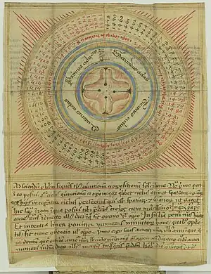 Latin 7478 consists of 17 folded leaves, perhaps previously attached to the tabs, but throughout the manuscript conservation it has obtained a new binding more like a traditional codex. It follows the pattern similar to what Johan Peter Gumbert calls H6r pattern: with the leaves opening on the top as well, then the first compartment unfolding the right, and only the last one on the left.[5][6] Latin 7478 has been copied by Paul of Kignin (could be also read as Szignin), whose autograph is found on folio 15, alongside with the supposed date of the manuscript production: 1456. The identity of the scribe remains to be investigated. However, some of the scholars presume that at least two people have been involved in the production of Latin 7478: a rather skilled almanac-maker, able to abbreviate diagrams and tables with a minimal loss of information, and a less experienced scribe, able to adapt 19-years cycles to a required date, lacking the knowledge to perform this procedure without distorting the time of syzygies.[7]