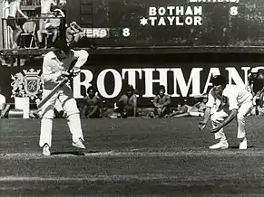 Taylor toured India and Sri Lanka over the winter of 1981/82, playing in seven Test matches. Though his keeping accounted for 19 batsmen, he scored only 88 runs over eight innings at 14.66.[67] He kept for only two of the ODI matches, with Jack Richards taking the gloves from him for the rest. After a brief return to Derbyshire for the County Championship in May,[27] he was again in the Test squad for the home series against India, taking nine catches but again a low 12.00 runs per innings from the three matches.[68] Pakistan swiftly followed, and Taylor made 54 in England's second innings of the first Test at Edgbaston on 29 July,[69]