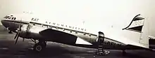 Passenger facilities were reduced to 4 bunks which when folded away allowed seating for 12, along with 4 seats along the opposite side of the aircraft.[41] Removable tables were provided in the cabin to lay out maps and do paperwork.[42] The exterior was then camouflaged in standard USAAF colours, with olive drab upper surfaces and neutral grey undersides,[10][45] and each aircraft had its name painted on the nose and over the cabin door, which would also be used by many later operators.[45] The names had previously been used in TWA publicity, but not painted on the aircraft.[8]