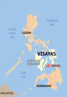 Bohol's 3rd congressional district is one of the three congressional districts of the Philippines in the province of Bohol. It has been represented in the House of Representatives of the Philippines since 1916 and earlier in the Philippine Assembly from 1907 to 1916.[3] The district consists of the southeastern municipalities of Alicia, Anda, Batuan, Bilar, Candijay, Carmen, Dimiao, Duero, Garcia Hernandez, Guindulman, Jagna, Lila, Loay, Loboc, Mabini, Pilar, Sevilla, Sierra Bullones and Valencia. It is currently represented in the 19th Congress by Alexie Tutor of the Nacionalista Party (NP).[4]
