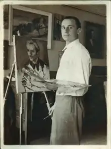 The beginnings of his works are figurative.[4] He was showing a talent since primary school. An apparent influence on him had illustrations by Adolf Kašpar, as we may assume, since there is a correlation in expression with works of Bohuš Čížek, as well in proportions of his figures, those realistically externalized. He was then led by painter Antonín Kameník at school in Prostějov, who was a disciple of professors Vlaho Bukovac and František Ženíšek at the Academy of Fine Arts in Prague.