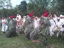 The Bohua dance has ancient origins. It is known that Lord Shiva or Khring Raja Baithow is the main God of the Sonowal Kacharis. It is mentioned in the Bhagavad and other Puranic texts that Daksha, the son of Lord Brahma, was the king of Tribhuvan. Daksha's youngest daughter Sati, who Daksha was very fond of, fell in love with Lord Shiva when she was a teenager. However, King Daksha didn't want to give his dear daughter's hand to Lord Shiva, who had no wealth, was always nude, and whose companions were ghosts and demons. Lord Brahma intervened and ordered Daksha to marry his daughter to Lord Shiva and Daksha obeyed. One day Shiva went to visit Daksha along with other guests. When Daksha came to see them everyone except Shiva greeted him! Angered by his dishonor, Daksha promised to take revenge upon Shiva himself. One day Daksha decided to organize a Mahayajna only to take revenge upon Shiva. He invited Yamraj, all the demigods and even the kings and queens. Everyone except lord Shiva was invited. When Shiva and Sati learned of this, she desired to visit her father's Mahayajna. After much reluctance Shiva let her go. But when she reached her father's house, Dakshya ridiculed her in front of everyone. Unable to bear this ridicule from her father, Sati left her body on the Mahajagya. When this news reached Kailash, ghosts and demons appeared on the yajna to vandalize it. When Lord Shiva arrived, a drop of sweat from his forehead fell on the ground and a warrior named Birbharda was created. This fearless warrior with the order of Shiva beheaded Dakshya! After this incident, the wife of King Dakshya came crying to Shiva and begged him to restore her husband's life. The powerful Lord Shiva then put the head of a sacrificed goat in Dakshya's body and lo! He was alive again! After his resurrection, the king and his queen danced in joy. Everyone praised the mighty Lord Shiva for his divine powers. The Sonowal Kacharis therefore performed the Bohua dance in praise of Lord Shiva. This dance signifies the beginning of a new life, a clean society, and the riddance of bad omen. In this way the Bohua dance has been performed for many generations.[1]