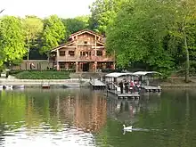 In 1877, the Chalet Robinson, a tea-room café designed in picturesque Swiss chalet style, was built on the lake's island, known as Robinson Island (French: Île Robinson, Dutch: Robinson Eiland). The chalet was twice destroyed by fire; the first time in 1896, and the second time in 1991.[11] The decision was made in 2006 to rebuild it and it reopened to the public in September 2009. The surface of the wooden building is approximately 300 m2 (3,200 sq ft), with a restaurant on the ground floor and a ballroom on the first floor. An electrical ferry boat links the island to the shores of the lake.