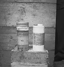As described in the training instructions: "The bomb consists of a cylindrical steel container... 3-3/4 in. in diameter, 9 in. high, weighing 6 lb. [...] It holds 3½ lb. (about 2 pints) of mustard gas... The bomb is fitted with a metal lid 2in. deep which is a good push fit on the body. This lid is fastened to the body by adhesive tape. In the centre of the underside of the lid is a striker for use on the match composition head of the ejection charge. [...] At one end of the bomb is a screwed plug. This is the filling plug. In order that any leakage may be readily detected the plug is coated with detector paint. [...] the ejection charge... consists of about 1/7 oz. of gunpowder connected by 32 in. of safety fuze to the match composition head. This length of fuze gives a delay of two minutes. The safety fuze is coiled in concentric circles in a shallow metal saucer and is set in bakelite cement. [...] The ejection charge has therefore the appearance of a circular plate 3½ in. in diameter. On the lower side is a threaded boss closed by a tin plate disc. This boss screwes into the bomb, the gunpowder charge being just above the tin plate disc. On the upper side of the ejection charge in the centre there is a flatened projection used for screwing the ejection charge into the bomb. The charge is also housed in the projection. On the rim there is another smaller projection holding the match composition head. The ejection charge is designed to blow out the end of the bomb fitted with the filling plug."[1]