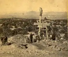 Ownership of the Cerrillos Hills region passed to Mexico in 1821 following the Mexican War of Independence and then to the United States in 1848 following the Mexican–American War. In May 1879, the administration of President Ulysses S. Grant began selling land in New Mexico, including the Cerrillos Hills region, to the American public.[4] Later that year, two miners from Colorado discovered gold and silver deposits within the Cerrillos Hills, which led to a mining boom and the establishment of numerous mining towns around the Cerrillos Hills.[2][4] In September 1879, the Los Cerrillos Mining District was established to regulate mining claims within the region.[5] By the end of 1880, at least 500 mining shafts had been opened within the district.[6]