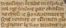 Bonaventure was commissioned by Alfonso X to translate the Book of Muhammad's Ladder into Latin and possibly also French. He worked from Abraham of Toledo's Spanish translation of an Arabic original.[5] A note in the only surviving French manuscript indicates that the French translation was completed in May 1264.[5][6] Some doubts have been raised about the ascription of the French translation to Bonaventure. It has been argued that he only produced the Latin translation shortly before 1264, while the French translation was made from the Latin shortly after by an anonymous translator from Provence.[7]
