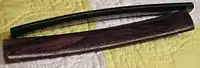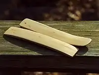 Rhythm bones are typically about 12 cm to 18 cm (5" to 7") in length, but can be much longer, and they are often curved, roughly resembling miniature barrel staves. Bones can also be flat, for example by the cutting of a yardstick. They are played by holding them between one's fingers, convex surfaces facing one another, and moving one's wrist in such a way that they knock against each other. One method involves placing the bones to either side of the middle finger such that approximately two-thirds of their length extends along the palm while the remainder protrudes above the fingers on the backside of the hand. The hand is held in a loose fist with the bones and the curled fingers roughly parallel to the palm, with the bone closest to the ring finger gently held against the palm by the tip of the ring finger placed on its edge, while the other bone is left free to move in the "hinge" formed by the index and middle fingers as they gently hold it. It is also possible to play the "hinge" on the lower (ring finger) bone while locking the top (index finger) bone against the palm.