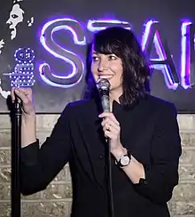 McFarlane did her first open mic in Vancouver, British Columbia, Canada. The manager of the club told her that she should enter a contest, "The Search for Canada's Funniest New Comic." McFarlane entered the contest and won. She then moved to New York where she landed a manager and an agent. She also spent time in Los Angeles doing stand-up and writing.[4] McFarlane has appeared on The Tonight Show with Jay Leno, Late Show with David Letterman, and The Late Late Show with Craig Kilborn. She appeared as a panelist on Tough Crowd with Colin Quinn and Red Eye w/Greg Gutfeld and as one of Dr. Katz's patients on Dr. Katz, Professional Therapist. In 2004, she appeared on season two of the NBC reality show Last Comic Standing. She was the first comedian eliminated.[5] In 2005, she had her own HBO One Night Stand special. In 2008, she had her own Comedy Central Presents half-hour special. She is also one of the hosts of the Nickelodeon show NickMom Night Out.[6] McFarlane made occasional appearances on the Opie and Anthony radio program and on the Opie and Jim Norton show. She has also hosted Comedy.tv.