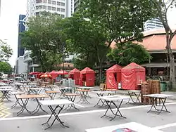 A portion of the street adjacent to Lau Pa Sat is closed in the evening for stalls selling satay. Boon Tat Street has been labeled as a heritage site by the Urban Redevelopment Authority.