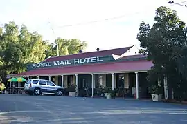 By late 1860 a public-house was constructed near the well by Messrs. Roberts and Roby, businessmen from Deniliquin, which became known as the Pine Ridge Inn (or Hotel).[6] With the establishment of a coach route between Deniliquin and Hay the public-house at Pine Ridge became a coach change-station for horses. Early recorded publicans were Chapman (1862) and William Kiely (May 1864).[7] By November 1864 Samuel Porter had purchased the Pine Ridge Hotel.[8] He carried out extensive repairs to the establishment which had "for some time been in a most dilapidated state" and constructed a dam on nearby Box Creek. In July 1866 Porter was granted a license for the Pine Ridge Hotel.[9]