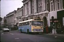 Boro'line was launched with a bold new livery, designed by Best Impressions, who would later go on to design the last independent Maidstone & District livery.[2] The livery consisted of a blue lower and yellow upper base, with white Boro'line logo, red Maidstone strapline and line, with a silver skirt.[9] From 1976 until well after the launch of Boro'line, vehicles in Maidstone could be seen in a variety of liveries, with some retaining either old Maidstone liveries, or the liveries in which they arrived in.[1] Some ochre vehicles only received a yellow front and Boro'line logos, or blue and yellow base with piecemeal detail application. The use in service of many hired or demonstration vehicles caused many other liveries or white buses with Boro'line logos to be used in service.