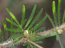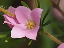 Boronia stricta is a slender shrub that grows to a height of 2 m (6 ft 7 in) with long soft hairs. The leaves are pinnate with between five and nine leaflets and 10–20 mm (0.39–0.79 in) long, the leaflets linear to almost cylindrical and up to 15 mm (0.59 in) long. A single or two or three pink flowers are borne in leaf axils, each flower on a hairy pedicel 2–5 mm (0.079–0.197 in) long. The four sepals are narrow triangular, 3–7 mm (0.12–0.28 in) long and hairy. The four petals are broadly elliptic, 5–9 mm (0.20–0.35 in) long and pink with a dark midline. The eight stamens are about 2 mm (0.079 in) long with the four stamens nearer the sepals swollen with a warty tip. The style is club-shaped. Flowering mainly occurs from September to December.[2][3]