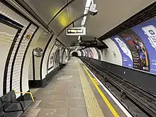 Southbound platform, looking north, after the 2022 refurbishment. This platform is directly below the northbound platform. It is only accessible via a narrow flight of stairs as stated. The arch of the exit passage is almost entirely hidden by modern panelling