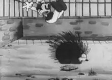 He tumbles to the ground and lands in the lion's den, awakening the lion. The lion chases Bosko. The ostrich sees them coming and dashes through a walrus pool, jumping on the walrus's back. The walrus sprints on its fins to catch up with the ostrich. They reach the wall of the zoo just a moment before Bosko, who jumps over their heads onto the coping stones of the wall. The lion crashes into the walrus and the ostrich, forming a three-headed animal ball that roars, barks and quacks, ending the cartoon.