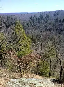 On the west side of the trail for the first part of its passage on the west ridge there is a little valley or sump that is often filled with water during the winter and other wet periods. There has been ice that can be walked on in this sump as late as March, attesting to the coldness of this area. The trail ascend a series of ridges to a summit. This summit is shear bedrock and devoid of trees in the southeast direction (i.e. facing into the hollow). To the west there is a brief tree-covered plateau after which the topography slopes down to a large swamp. The trail continues after the summit in a southwest direction then turns in a serpentine arc and descends northwest of the hollow onto Barlow's Mill road.