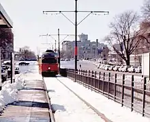 The station has the third-highest ridership on the B branch (after only Harvard Avenue and Packards Corner).[4] In the early 2000s, the MBTA modified key surface stops with raised platforms for accessibility. Portable lifts were installed at Boston University Central around 2000 as a temporary measure.[5][6] Construction at Boston University Central and Boston University East was part of a $32 million modification of thirteen B, C, and E branch stations. [7] During construction, an interim station with temporary platforms between the two stops was used.[2] Construction began on March 18, 2002, a week behind schedule due to delays in finishing up similar work at Harvard Avenue and Washington Street. The project was then expected to be completed within six months.[2]