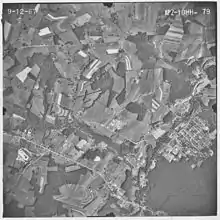Aerial view of Boswell and vicinity, May 12, 1939. Photograph was taken six weeks after the mine closed permanently. Note the coal tipple just outside the town, which was dismantled in 1940.