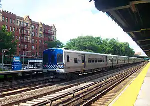 Southbound Harlem Line train of M7A cars bypassing the station via the middle tracks