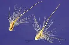 This perennial bunchgrass grows to 2 to 3 feet in height. The leaves reach 8 inches long. The stems are often purplish toward the base. The inflorescence is white and hairy. The plant produces many seeds.[3]