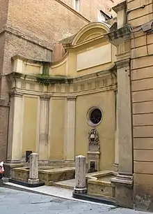 | Fonte di San Francesco | Via die Rossi / Via del Comune 43°19′19″N 11°19′59″E / 43.321986°N 11.33302°E | It is supplied by a derivative from the Bottino maestro di Fonte Gaia.[28] The name comes from the nearby Basilica di San Francesco, but is also called Fonte di San Bernardino. Contains the statue of Francesco d'Agnolo (called Barbicone) by Angelo Canevari.[29] He is the fountain of the Bruco Contrada. | Fonte di San Francesco | |