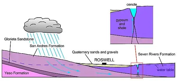 The Bottomless Lakes occur at the base of an escarpment formed by the gypsum-rich Seven Rivers Formation. Ground water in the underlying San Andres artisan aquifer rises along faults at the escarpment and dissolves the gypsum thereby creating sinkholes or cenotes.[3]