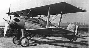 The fuselage had an oval cross section.[1] A large spinner blended smoothly into the engine cowling, though the nine cylinder heads of the 440 hp (328 kW) Bristol Jupiter VII engine protruded without further shrouding; a Townend ring was discussed but not fitted. Two Vickers machine guns were mounted on the fuselage immediately behind the engine and firing through the propeller and between the cylinder heads. The maximum fuselage diameter was just behind the wing at the single cockpit, giving the aircraft a slightly humped appearance. The pilot had a clear forward view under the upper wing and a trailing edge cut-out helped his upward view. The fin and the strut braced tailplanes were both rather rectangular and low aspect ratio. Both the rudder and elevators were horn balanced, the latter with balance surfaces extending beyond the tailplane. The undercarriage had a single axle and was mounted on vee struts. There was a faired tail skid.[1]
