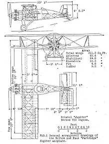 The Partridge[1][2] was a single bay biplane with the unswept constant chord square tipped wings characteristic of Boulton & Paul at this time. There was slight stagger and only the lower wing, smaller in span and chord, had dihedral. The interplane struts leaned outwards markedly and the centre section struts more so. Initially there were ailerons only on the upper wings, but soon they were added to the lower wing with a noticeable vertical interconnecting rigid link. Like the rest of the aircraft the wings were fabric covered.[1]
