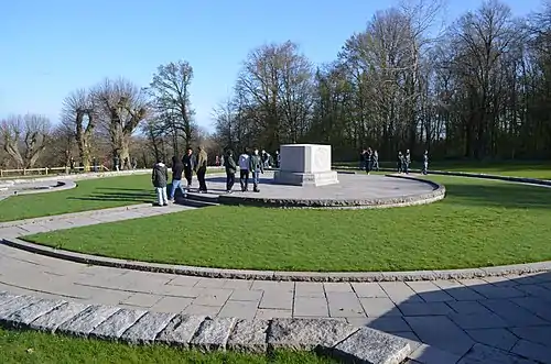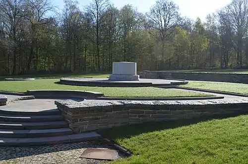 The remaining six memorials, to be built on sites at Passchendaele and Hill 62 in Belgium and at Le Quesnel, Dury, Courcelette and Bourlon Wood in France would each received a modest memorial designed under the supervision of architect and advisor to the Battlefield Memorials Commission, Percy Erskine Nobbs.[4][5] Situated on key points of the battlefield they memorialize, the central feature of the memorials would be a 13-tonne cube-shaped block of white-grey granite quarried near Stanstead, Quebec. The blocks are essentially identical, carved with wreathes on two opposing sides and inscribed with the phrase "Honour to the Canadians who on the fields of Flanders and France fought in the cause of the Allies with sacrifice and devotion" around the base. Though uniform in design, they are differentiated in the brief English and French descriptions of the battle they commemorate inscribed on their sides and the small parks that surround the memorial blocks, which vary in shape and layout.