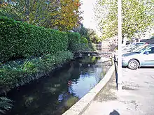 Bourne Eau rises in The Wellhead, otherwise known as St Peter's Pool, in Bourne.[3] The Wellhead is a natural artesian spring, rising from the limestone some 165 feet (50 m) below the land surface.[4] It once formed the source of the water defences for Bourne Castle as well as the power for the town's three mills.[3] From the Wellhead, a branch flows to the east, along the southern edge of the castle site, while another flows north, then east and south, enclosing the castle site and Wellhead Gardens to rejoin the first branch near Baldock's Mill. A culvert carries the water under South Street, and it flows along the edge of Church Lane,[5] where it is crossed by a small cast-iron bridge with gates, providing rear access to Bourne Eau House.[6] It carries the date 1832. On the other side of Church Lane is the parish church of St Peter and St Paul, a grade I listed structure that was originally the chapel for an Arrouaisian order of Canons founded in 1138.[7]