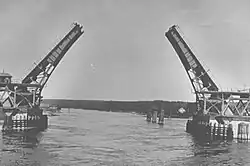 Work on the bridge began on August 10, 1910, during construction of the Cape Cod Canal.[2] The bridge abutments were completed by December.[3] In April 1911, the bridge was reported as being nearly completed.[4] Reports at that time noted that once the new bridge was opened, an existing bridge over the Monument River in Bourne would be closed.[5] On May 20, the bridge was physically opened (lifted) for the first time.[6] In late June, the bridge was described as "ready", with plans being made for its immediate opening.[7]